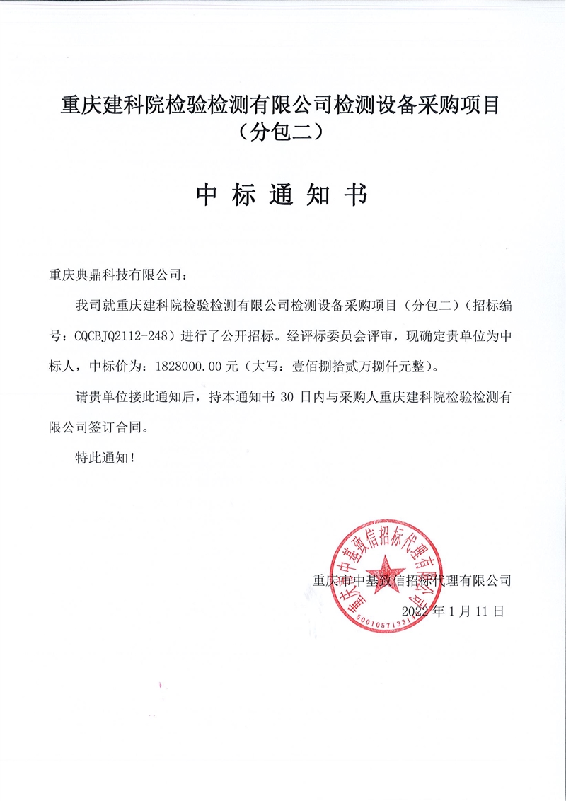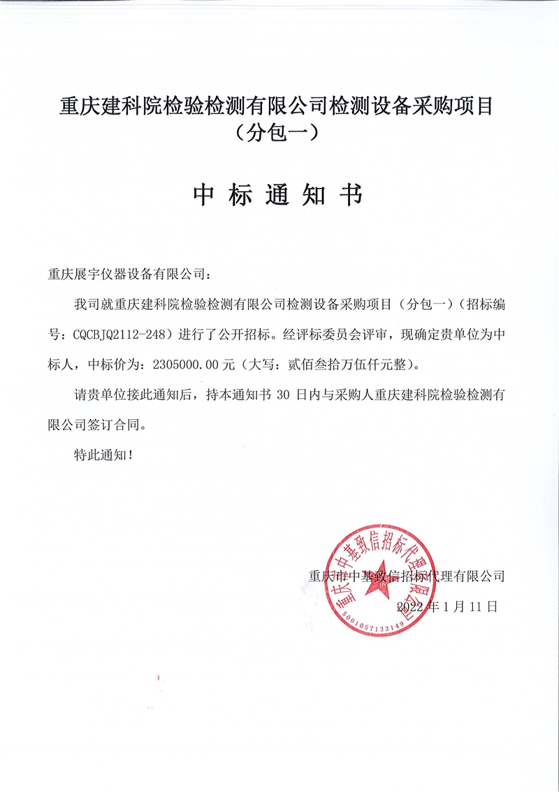 重慶建科院檢驗(yàn)檢測(cè)有限公司委托重慶市中基致信招標(biāo)代理有限公司對(duì)我公司檢測(cè)設(shè)備采購(gòu)項(xiàng)目(項(xiàng)目號(hào):CQCBJQ2112-248 )分包一(力學(xué))和分包二(化學(xué))進(jìn)行了公開(kāi)招標(biāo)采購(gòu),現(xiàn)已完成全部采購(gòu)程序。確認(rèn)重慶展宇儀器設(shè)備有限公司為分包一(力學(xué))中標(biāo)人,中標(biāo)價(jià)為2305000元(貳佰參拾萬(wàn)伍仟佰元整)。確認(rèn)重慶典鼎科技有限公司為分包二(化學(xué))中標(biāo)人,中標(biāo)價(jià)為1828000元(壹佰捌拾貳萬(wàn)捌仟元整)。
