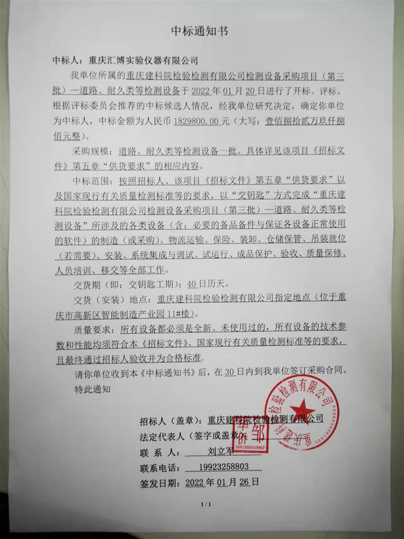 重慶建科院檢驗檢測有限公司委托中招國際招標(biāo)有限公司對我公司檢測設(shè)備采購項目(項目號:TC219D1RL )重慶建科院檢驗檢測有限公司檢測設(shè)備采購項目(第三批)—道路、耐久類等檢測設(shè)備進行了公開招標(biāo)采購,現(xiàn)已完成全部采購程序。確認(rèn)重慶匯博實驗儀器設(shè)備有限公司為檢測設(shè)備采購項目(第三批)—道路、耐久類等檢測設(shè)備中標(biāo)人,中標(biāo)價為1829800.00元(大寫:壹佰捌拾貳萬玖仟捌佰元整)。