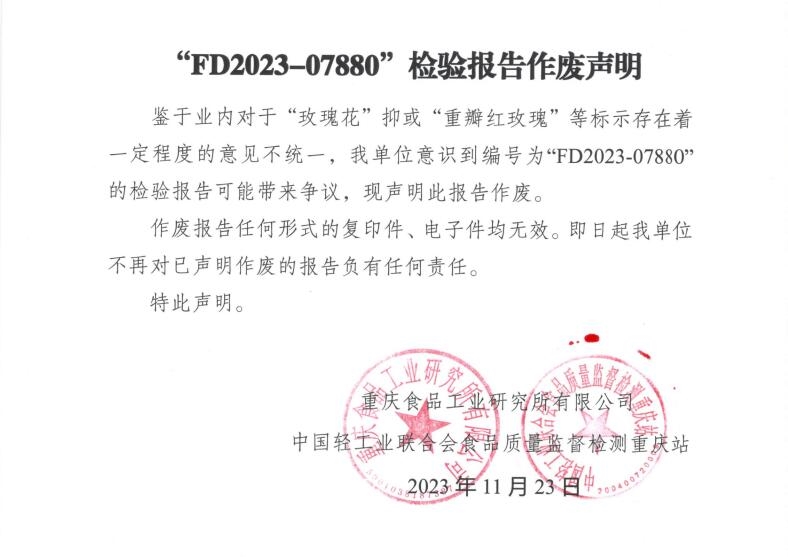 鑒于業(yè)內對于“玫瑰花”抑或“重瓣紅玫瑰”等標示存在著一定程度的意見不統(tǒng)一,我單位意識到編號為“FD2023-07880”的檢驗報告可能帶來爭議,現(xiàn)聲明此報告作廢。