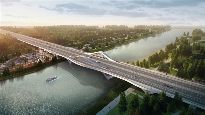 主橋設計采用梁-拱型組合體系,立意“荷香”,將荷葉形態融入到橋梁造型當中,荷葉浮于運河之上,整個造型宛如運河上盛開的荷花,生態自然,與環境融為一體,給人以生機盎然、自然和諧的美感。