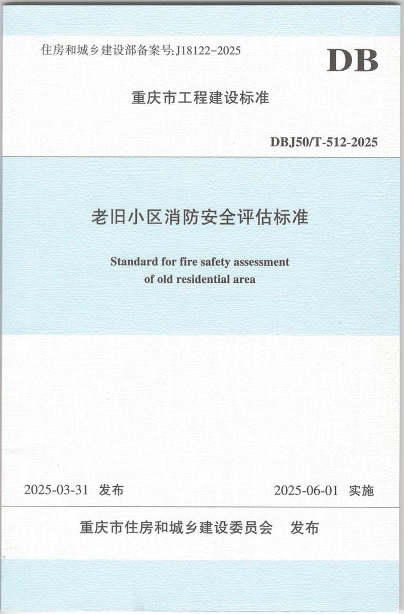 近日,由重慶設計集團下屬子企業重慶市建筑科學研究院有限公司(以下簡稱"市建科院")牽頭編制的重慶市工程建設標準《老舊小區消防安全評估標準》(DBJ50/T-512-2025)通過重慶市住房和城鄉建設委員會審批正式發布,將于2025年6月1日起開始實施。