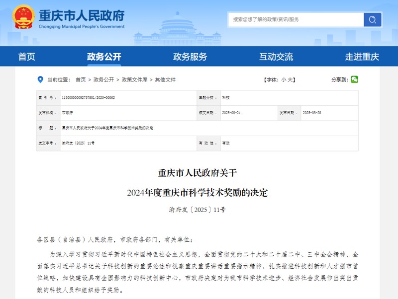 重慶市人民政府網(wǎng)站發(fā)布2024年度重慶市科學技術(shù)獎勵的獎勵決定和獲獎名單